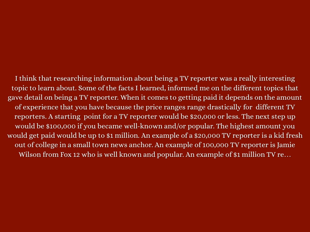 I think that researching information about being a TV reporter was a really interesting topic to learn about. Some of the facts I learned, informed me on the different topics that gave detail on being a TV reporter. When it comes to getting paid it depends on the amount of experience that you have because the price ranges range drastically for different TV reporters. A starting point for a TV reporter would be $20,000 or less. The next step up would be $100,000 if you became well-known and/or popular. The highest amount you would get paid would be up to $1 million. An example of a $20,000 TV reporter is a kid fresh out of college in a small town news anchor. An example of 100,000 TV reporter is Jamie Wilson from Fox 12 who is well known and popular. An example of $1 million TV reporter is David Muir from World News/2020/etc. on ABC.