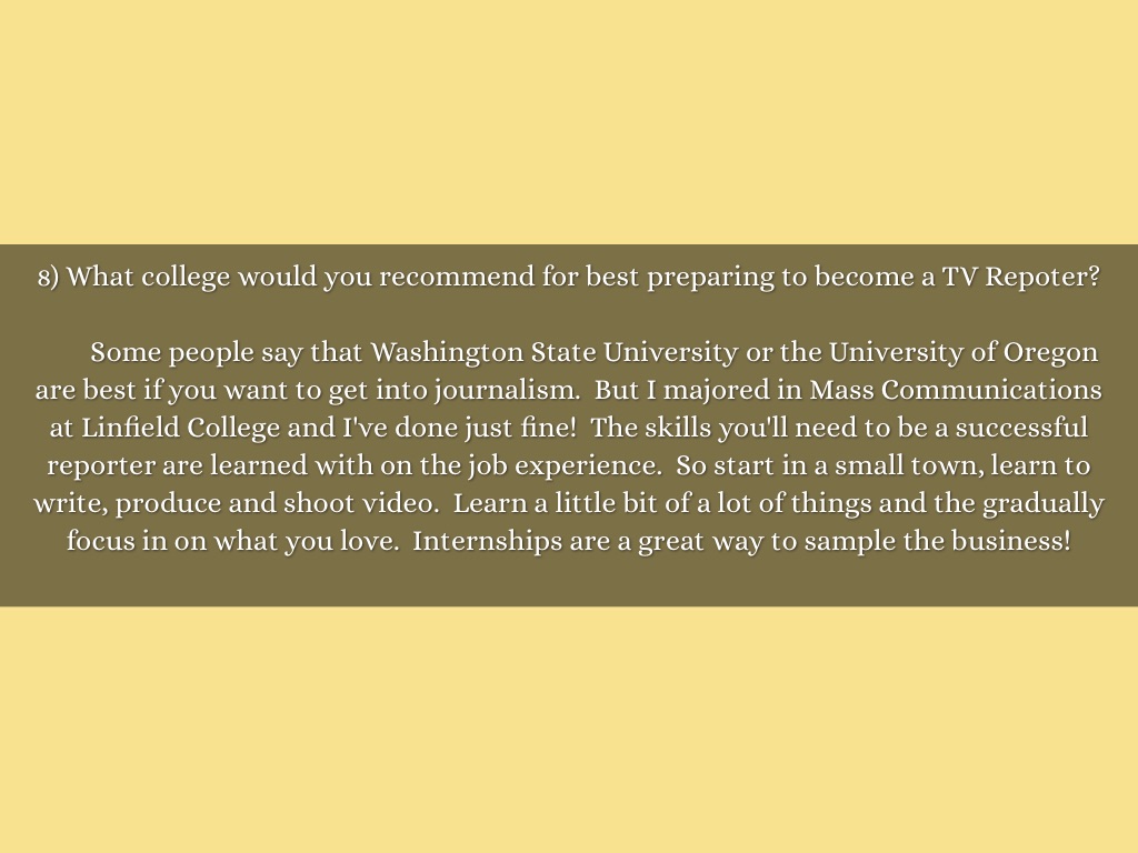 Some people say that Washington State University or the University of Oregon are best if you want to get into journalism. But I majored in Mass Communications at Linfield College and I've done just fine! The skills you'll need to be a successful reporter are learned with on the job experience. So start in a small town, learn to write, produce and shoot video. Learn a little bit of a lot of things and the gradually focus in on what you love. Internships are a great way to sample the business!