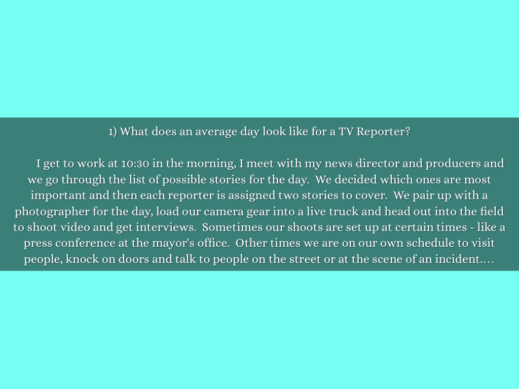 I get to work at 10:30 in the morning, I meet with my news director and producers and we go through the list of possible stories for the day. We decided which ones are most important and then each reporter is assigned two stories to cover. We pair up with a photographer for the day, load our camera gear into a live truck and head out into the field to shoot video and get interviews. Sometimes our shoots are set up at certain times - like a press conference at the mayor's office. Other times we are on our own schedule to visit people, knock on doors and talk to people on the street or at the scene of an incident.
