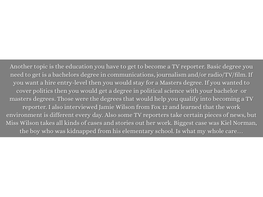 Another topic is the education you have to get to become a TV reporter. Basic degree you need to get is a bachelors degree in communications, journalism and/or radio/TV/film. If you want a hire entry-level then you would stay for a Masters degree. If you wanted to cover politics then you would get a degree in political science with your bachelor or masters degrees. Those were the degrees that would help you qualify into becoming a TV reporter. I also interviewed Jamie Wilson from Fox 12 and learned that the work environment is different every day. Also some TV reporters take certain pieces of news, but Miss Wilson takes all kinds of cases and stories out her work. Biggest case was Kiel Norman, the boy who was kidnapped from his elementary school. Is what my whole career project was all about and the key points of it to.