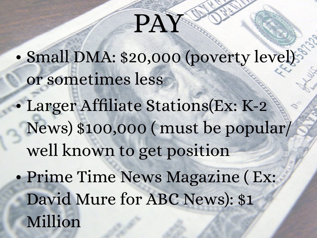 - Larger Affiliate Stations(Ex: K-2 News) $100,000 ( must be popular/well known to get position