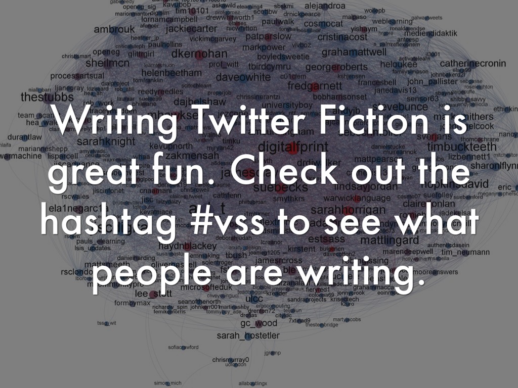 Writing Twitter Fiction is great fun. Check out the hashtag #vss to see what people are writing.