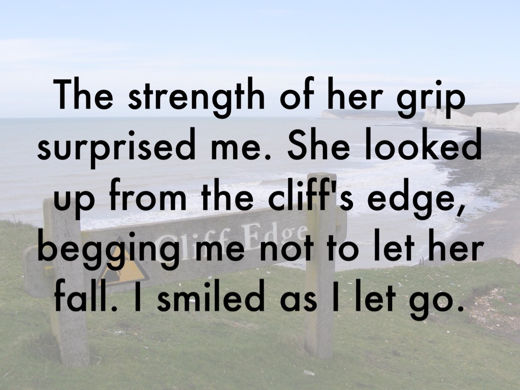 The strength of her grip surprised me. She looked up from the cliff's edge, begging me not to let her fall. I smiled as I let go.