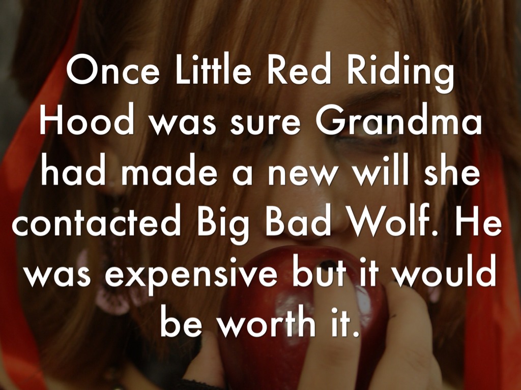 Once Little Red Riding Hood was sure Grandma had made a new will she contacted Big Bad Wolf. He was expensive but it would be worth it.
