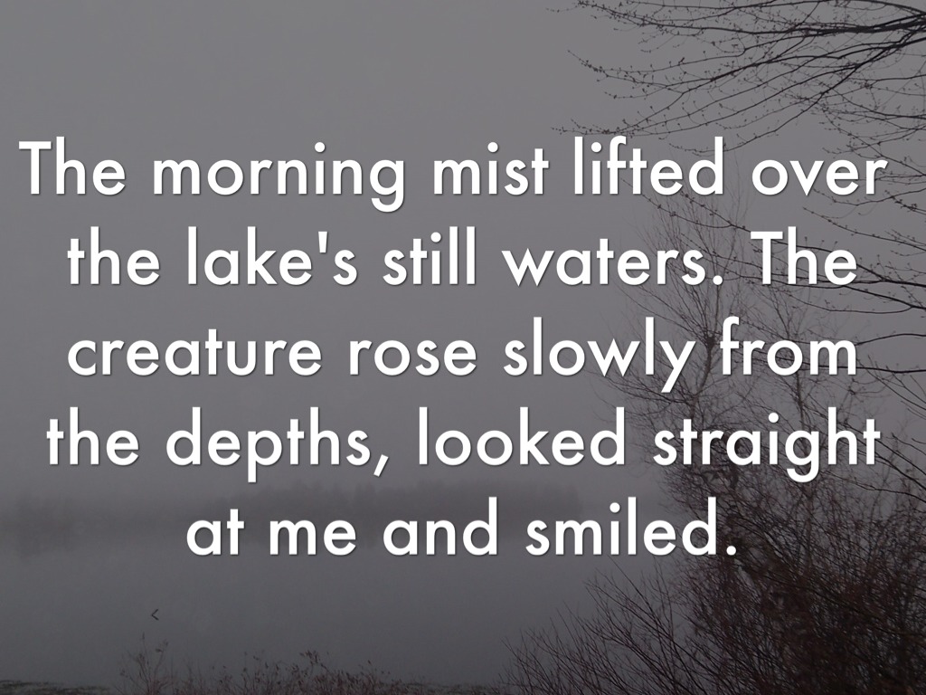 The morning mist lifted over the lake's still waters. The creature rose slowly from the depths, looked straight at me and smiled.
