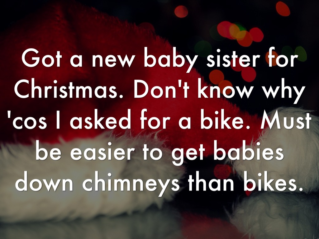 Got a new baby sister for Christmas. Don't know why 'cos I asked for a bike. Must be easier to get babies down chimneys than bikes.