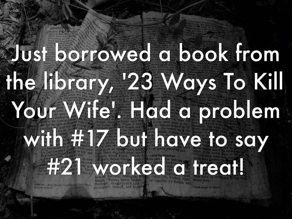 Just borrowed a book from the library, '23 Ways To Kill Your Wife'. Had a problem with #17 but have to say #21 worked a treat!