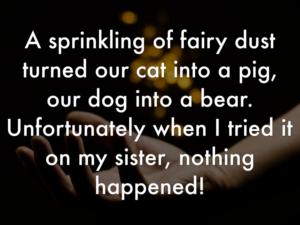 A sprinkling of fairy dust turned our cat into a pig, our dog into a bear. Unfortunately when I tried it on my sister, nothing happened!