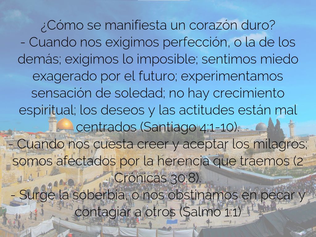¿Cómo se manifiesta un corazón duro? - Cuando nos exigimos perfección, o la de los demás; exigimos lo imposible; sentimos miedo exagerado por el futuro; experimentamos sensación de soledad; no hay crecimiento espiritual; los deseos y las actitudes están mal centrados (Santiago 4:1-10). - Cuando nos cuesta creer y aceptar los milagros; somos afectados por la herencia que traemos (2 Crónicas 30:8). - Surge la soberbia, o nos obstinamos en pecar y contagiar a otros (Salmo 1:1)