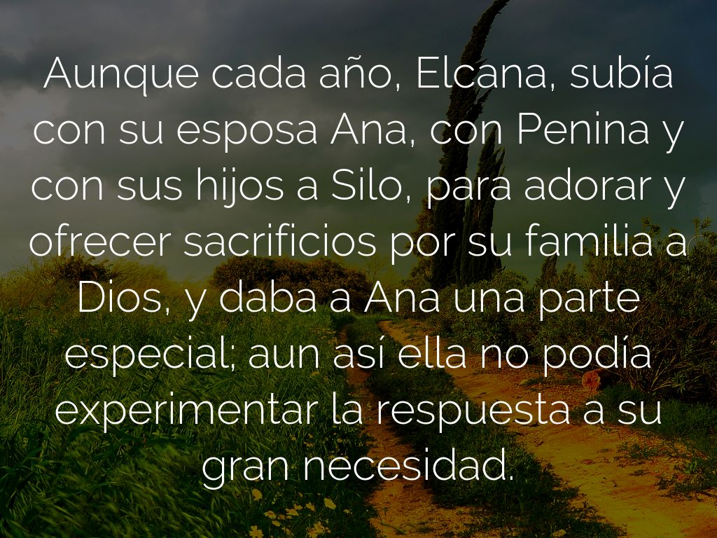 Aunque cada año, Elcana, subía con su esposa Ana, con Penina y con sus hijos a Silo, para adorar y ofrecer sacrificios por su familia a Dios, y daba a Ana una parte especial; aun así ella no podía experimentar la respuesta a su gran necesidad.