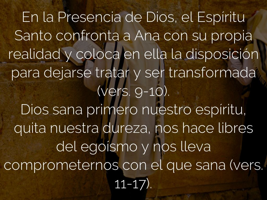 En la Presencia de Dios, el Espíritu Santo confronta a Ana con su propia realidad y coloca en ella la disposición para dejarse tratar y ser transformada (vers. 9-10). Dios sana primero nuestro espíritu, quita nuestra dureza, nos hace libres del egoísmo y nos lleva comprometernos con el que sana (vers. 11-17).