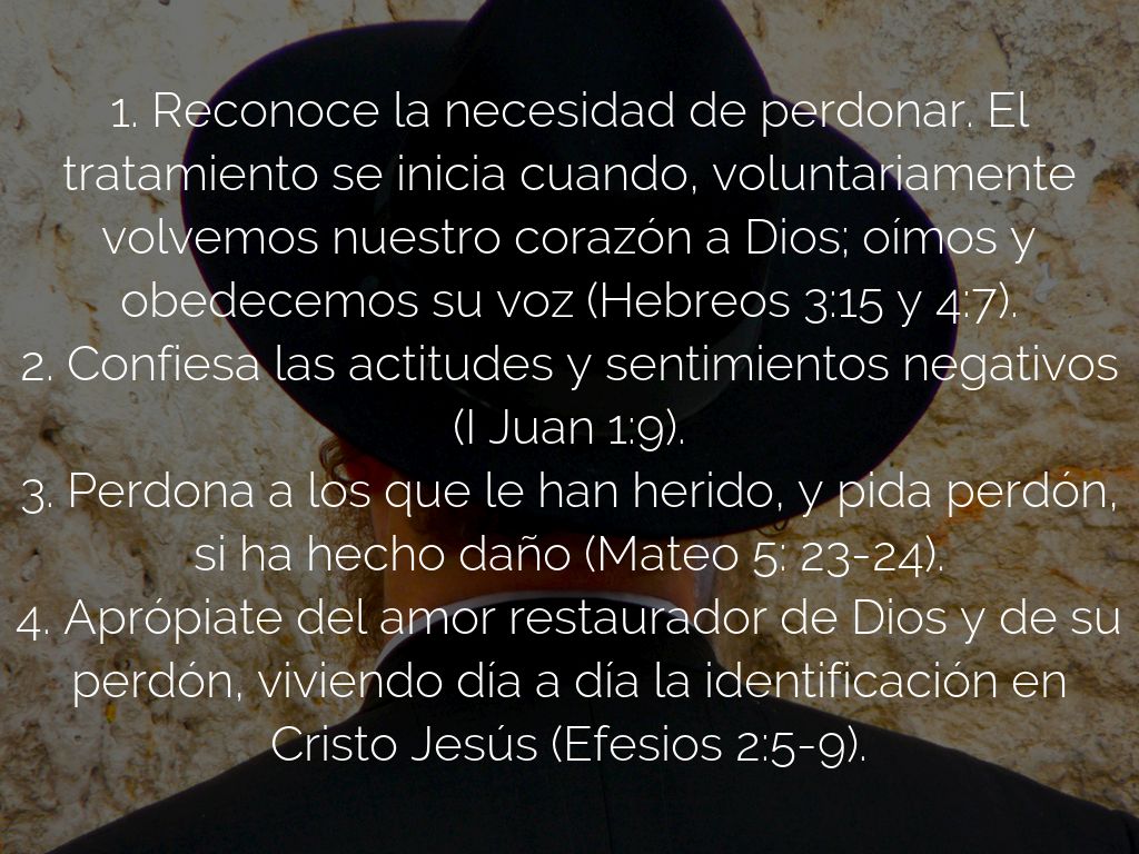 1. Reconoce la necesidad de perdonar. El tratamiento se inicia cuando, voluntariamente volvemos nuestro corazón a Dios; oímos y obedecemos su voz (Hebreos 3:15 y 4:7). 2. Confiesa las actitudes y sentimientos negativos (I Juan 1:9). 3. Perdona a los que le han herido, y pida perdón, si ha hecho daño (Mateo 5: 23-24). 4. Aprópiate del amor restaurador de Dios y de su perdón, viviendo día a día la identificación en Cristo Jesús (Efesios 2:5-9).