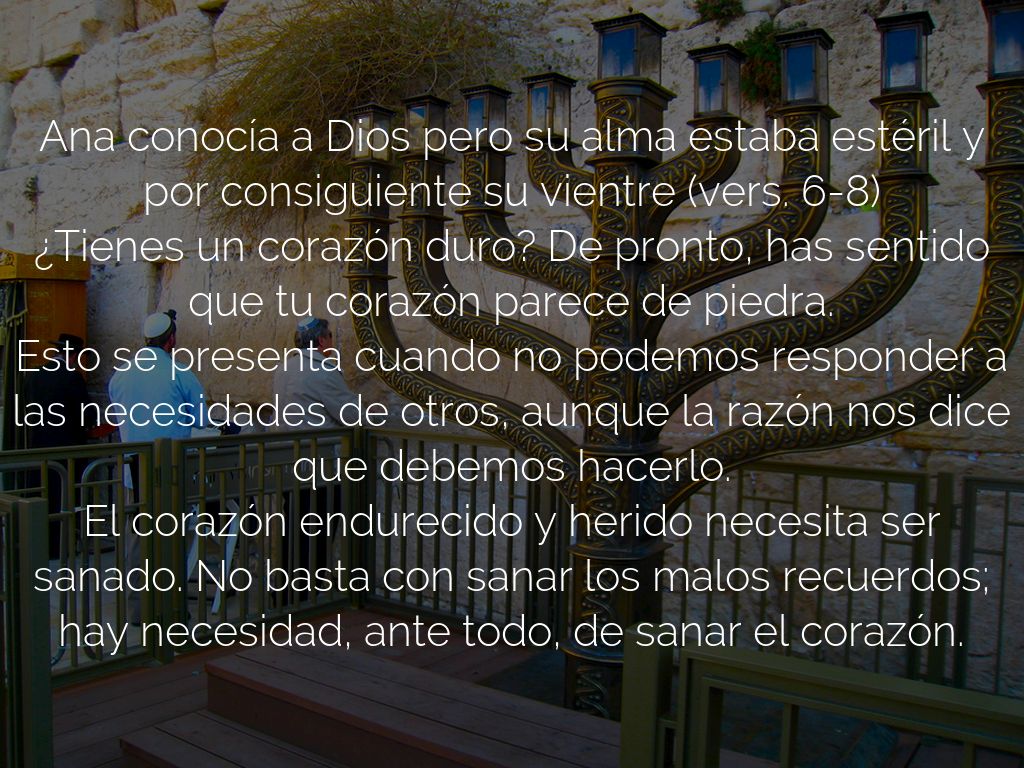 Ana conocía a Dios pero su alma estaba estéril y por consiguiente su vientre (vers. 6-8) ¿Tienes un corazón duro? De pronto, has sentido que tu corazón parece de piedra. Esto se presenta cuando no podemos responder a las necesidades de otros, aunque la razón nos dice que debemos hacerlo. El corazón endurecido y herido necesita ser sanado. No basta con sanar los malos recuerdos; hay necesidad, ante todo, de sanar el corazón.