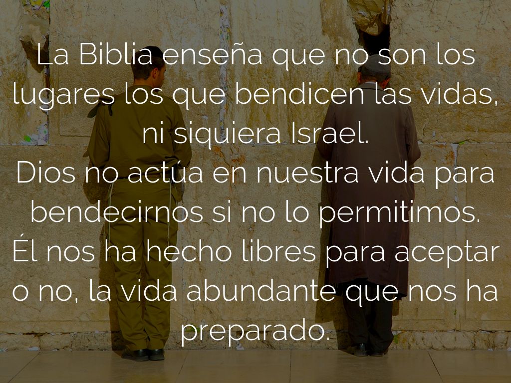La Biblia enseña que no son los lugares los que bendicen las vidas, ni siquiera Israel. Dios no actúa en nuestra vida para bendecirnos si no lo permitimos. Él nos ha hecho libres para aceptar o no, la vida abundante que nos ha preparado.