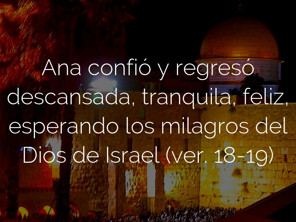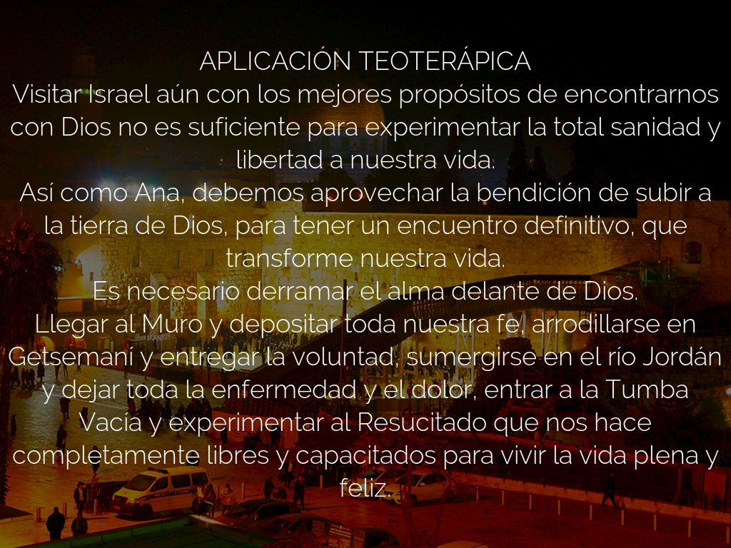 APLICACIÓN TEOTERÁPICA Visitar Israel aún con los mejores propósitos de encontrarnos con Dios no es suficiente para experimentar la total sanidad y libertad a nuestra vida. Así como Ana, debemos aprovechar la bendición de subir a la tierra de Dios, para tener un encuentro definitivo, que transforme nuestra vida. Es necesario derramar el alma delante de Dios. Llegar al Muro y depositar toda nuestra fe, arrodillarse en Getsemaní y entregar la voluntad, sumergirse en el río Jordán y dejar toda la enfermedad y el dolor, entrar a la Tumba Vacía y experimentar al Resucitado que nos hace completamente libres y capacitados para vivir la vida plena y feliz.