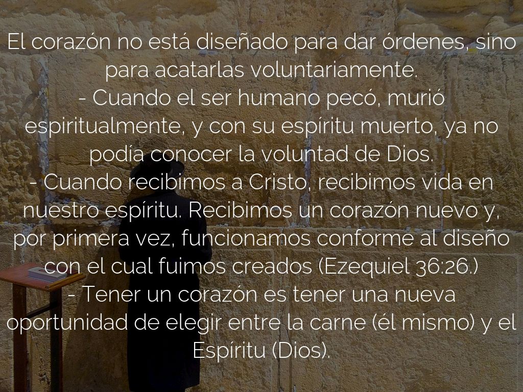 El corazón no está diseñado para dar órdenes, sino para acatarlas voluntariamente. - Cuando el ser humano pecó, murió espiritualmente, y con su espíritu muerto, ya no podía conocer la voluntad de Dios. - Cuando recibimos a Cristo, recibimos vida en nuestro espíritu. Recibimos un corazón nuevo y, por primera vez, funcionamos conforme al diseño con el cual fuimos creados (Ezequiel 36:26.) - Tener un corazón es tener una nueva oportunidad de elegir entre la carne (él mismo) y el Espíritu (Dios).