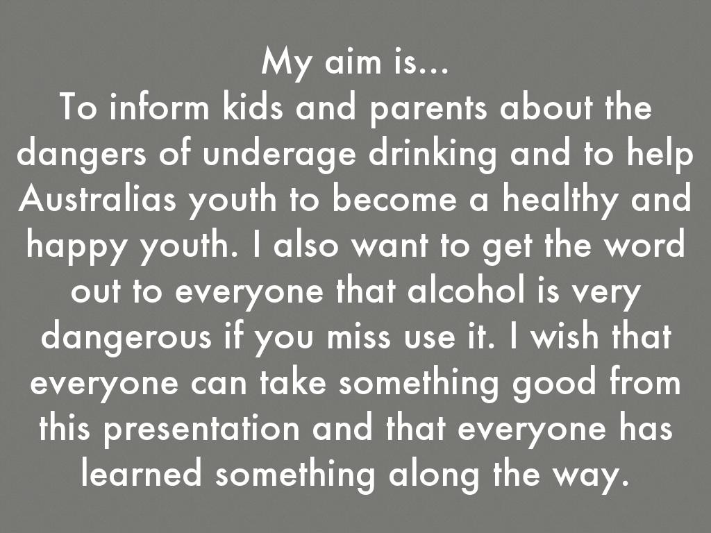 To inform kids and parents about the dangers of underage drinking and to help Australias youth to become a healthy and happy youth. I also want to get the word out to everyone that alcohol is very dangerous if you miss use it. I wish that everyone can take something good from this presentation and that everyone has learned something along the way.
