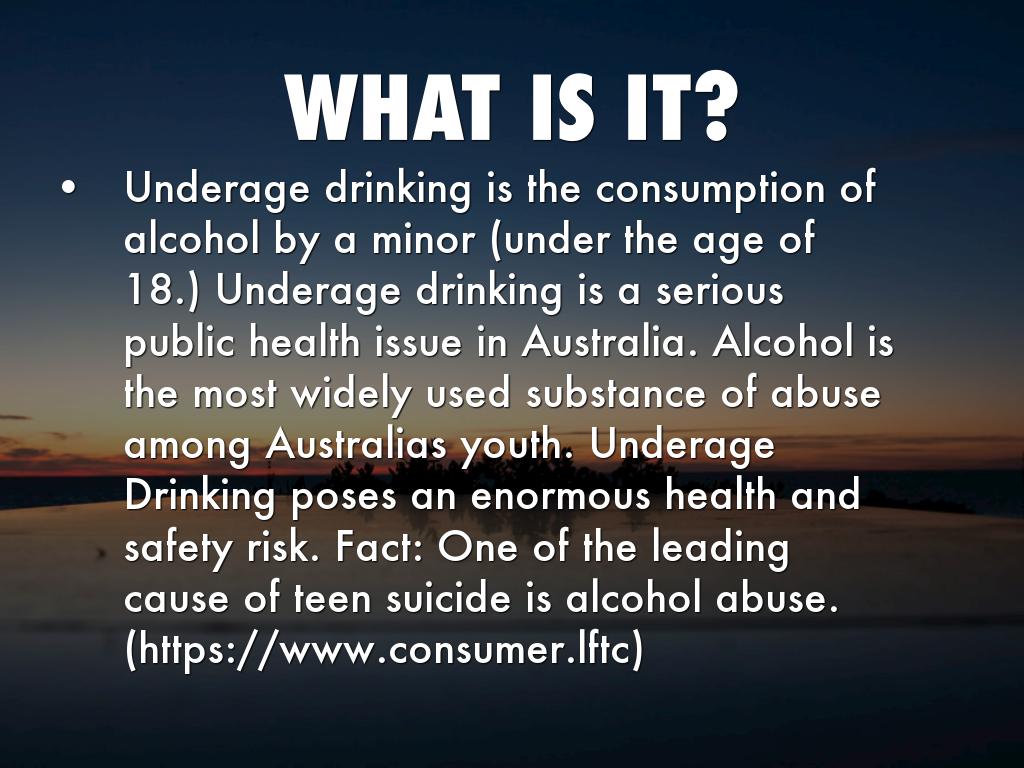 • Underage drinking is the consumption of alcohol by a minor (under the age of 18.) Underage drinking is a serious public health issue in Australia. Alcohol is the most widely used substance of abuse among Australias youth. Underage Drinking poses an enormous health and safety risk. Fact: One of the leading cause of teen suicide is alcohol abuse. (https://www.consumer.lftc)