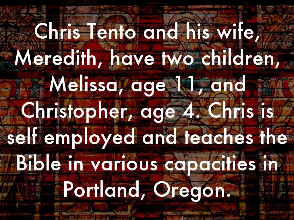 Chris Tento and his wife, Meredith, have two children, Melissa, age 11, and Christopher, age 4. Chris is self employed and teaches the Bible in various capacities in Portland, Oregon.