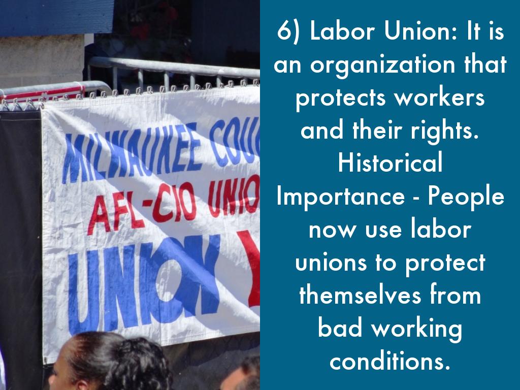 6) Labor Union: It is an organization that protects workers and their rights. Historical Importance - People now use labor unions to protect themselves from bad working conditions.