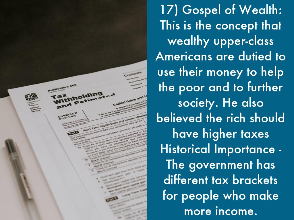 17) Gospel of Wealth: This is the concept that wealthy upper-class Americans are dutied to use their money to help the poor and to further society. He also believed the rich should have higher taxes Historical Importance - The government has different tax brackets for people who make more income.