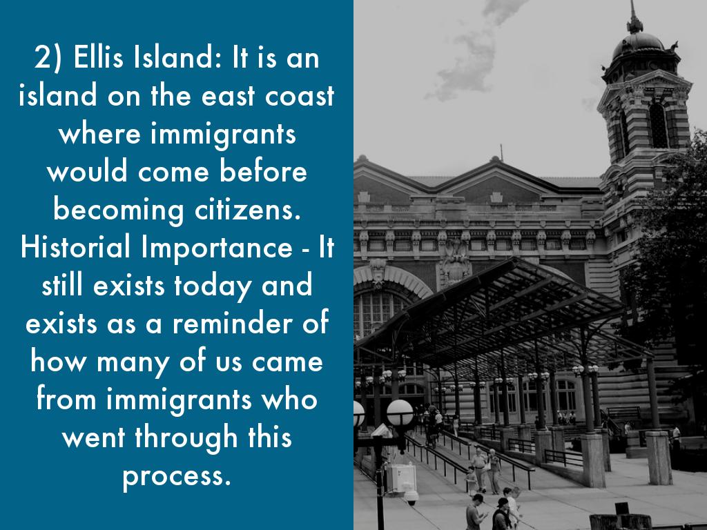 2) Ellis Island: It is an island on the east coast where immigrants would come before becoming citizens. Historial Importance - It still exists today and exists as a reminder of how many of us came from immigrants who went through this process.