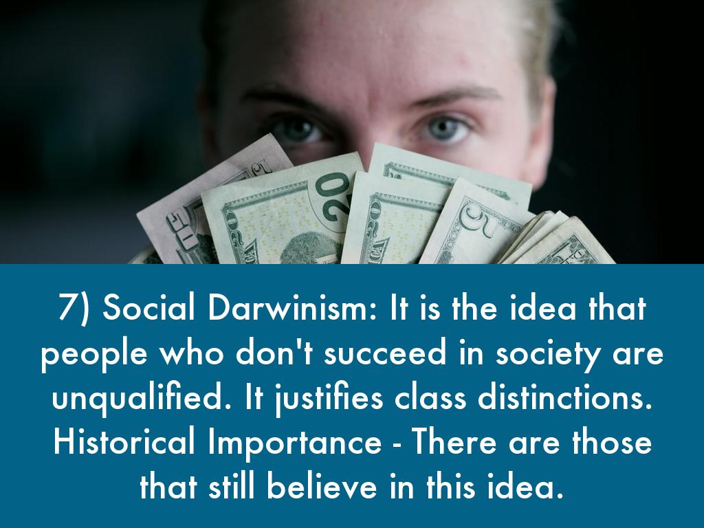 7) Social Darwinism: It is the idea that people who don't succeed in society are unqualified. It justifies class distinctions. Historical Importance - There are those that still believe in this idea.