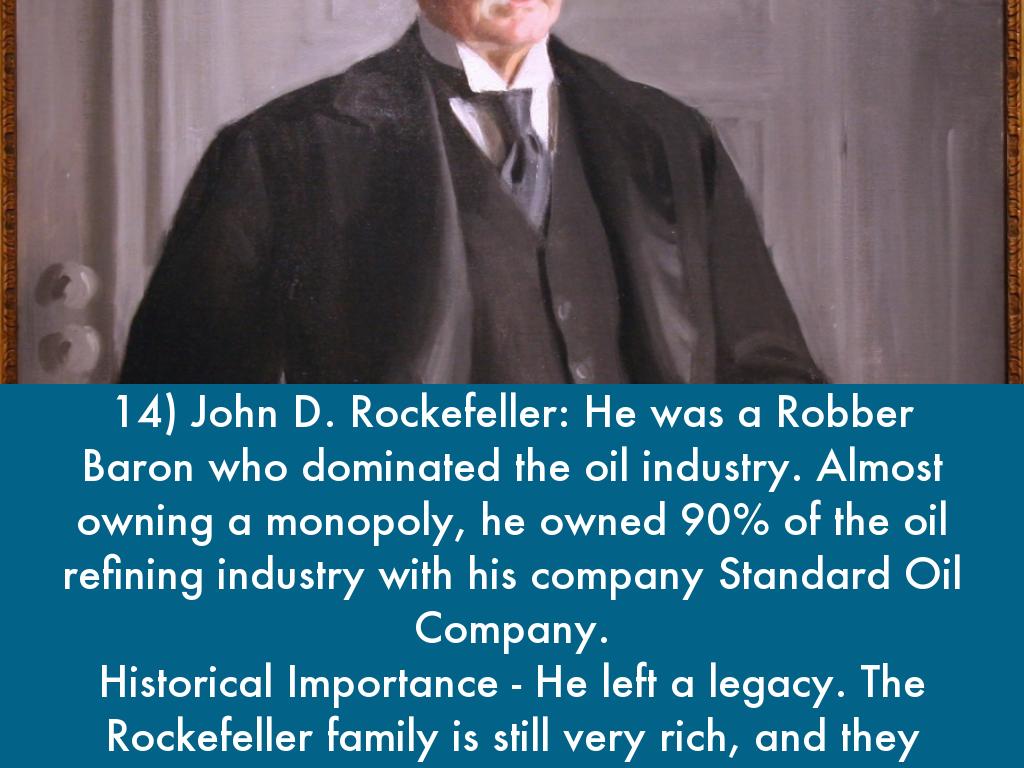 14) John D. Rockefeller: He was a Robber Baron who dominated the oil industry. Almost owning a monopoly, he owned 90% of the oil refining industry with his company Standard Oil Company. Historical Importance - He left a legacy. The Rockefeller family is still very rich, and they donate money to the public every year.