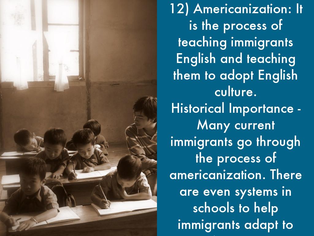 12) Americanization: It is the process of teaching immigrants English and teaching them to adopt English culture. Historical Importance - Many current immigrants go through the process of americanization. There are even systems in schools to help immigrants adapt to America.
