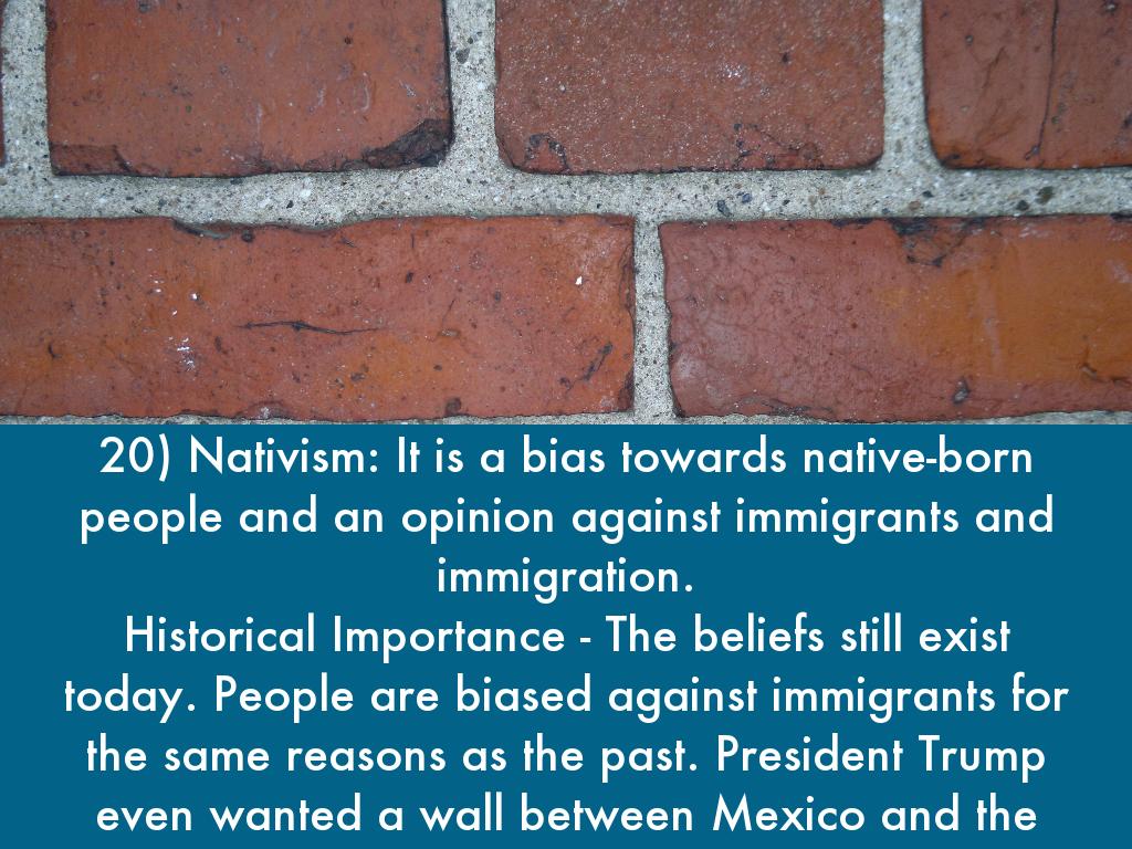 20) Nativism: It is a bias towards native-born people and an opinion against immigrants and immigration. Historical Importance - The beliefs still exist today. People are biased against immigrants for the same reasons as the past. President Trump even wanted a wall between Mexico and the U.S.