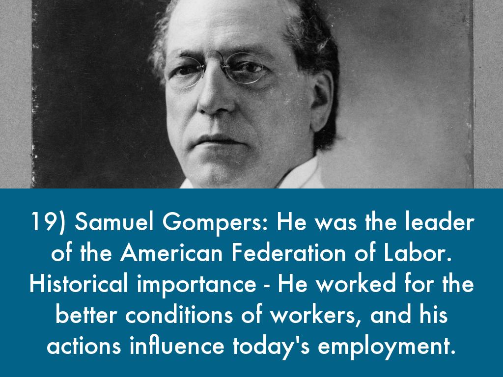 19) Samuel Gompers: He was the leader of the American Federation of Labor. Historical importance - He worked for the better conditions of workers, and his actions influence today's employment.