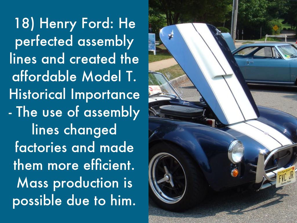 18) Henry Ford: He perfected assembly lines and created the affordable Model T. Historical Importance - The use of assembly lines changed factories and made them more efficient. Mass production is possible due to him.