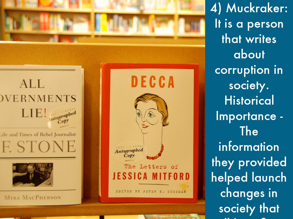 4) Muckraker: It is a person that writes about corruption in society. Historical Importance - The information they provided helped launch changes in society that still benefit us today.