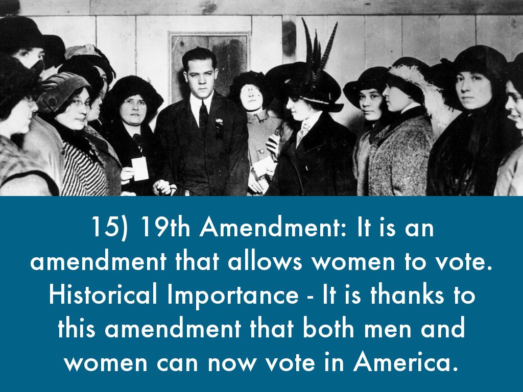 15) 19th Amendment: It is an amendment that allows women to vote. Historical Importance - It is thanks to this amendment that both men and women can now vote in America.