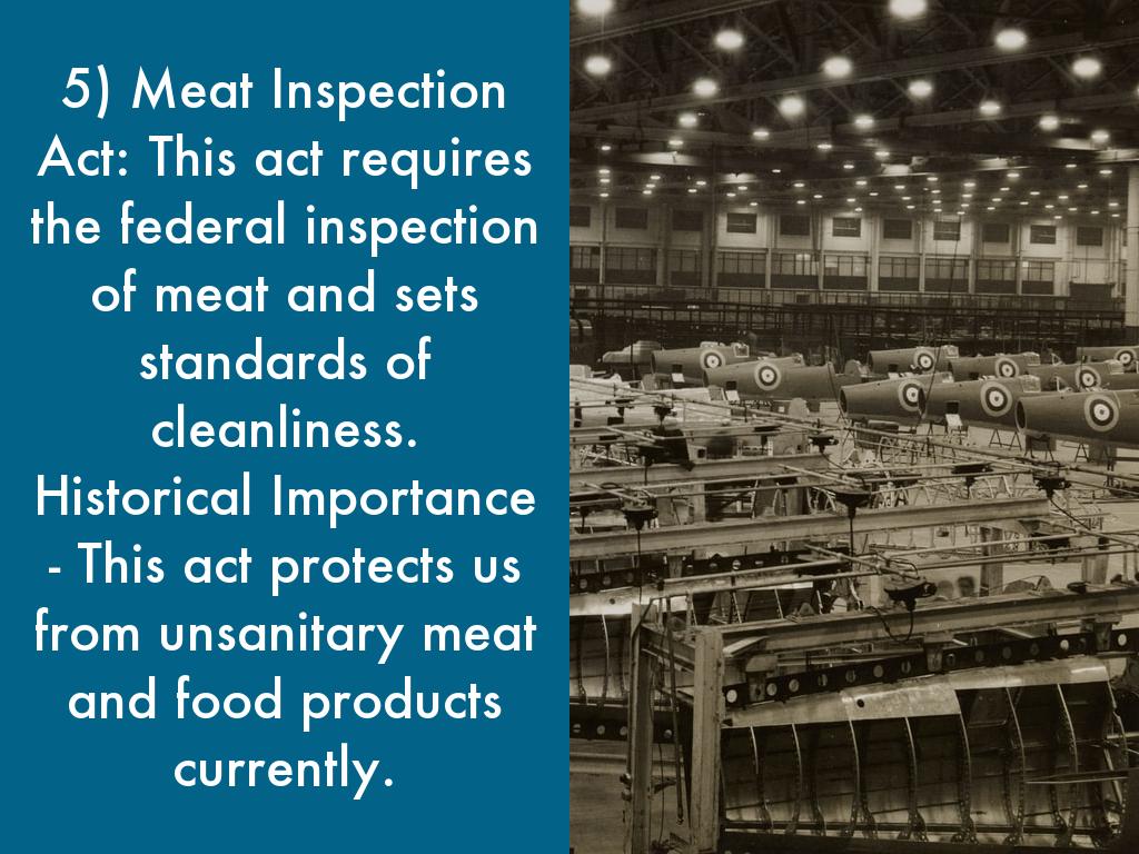 5) Meat Inspection Act: This act requires the federal inspection of meat and sets standards of cleanliness. Historical Importance - This act protects us from unsanitary meat and food products currently.