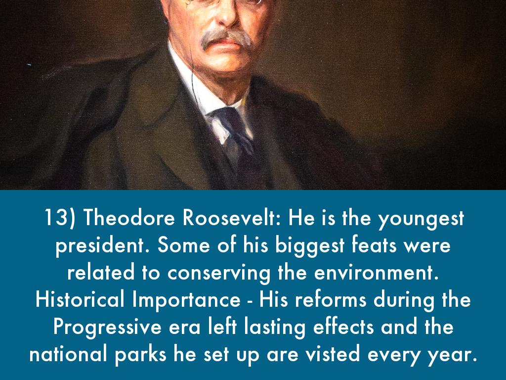 13) Theodore Roosevelt: He is the youngest president. Some of his biggest feats were related to conserving the environment. Historical Importance - His reforms during the Progressive era left lasting effects and the national parks he set up are visted every year.