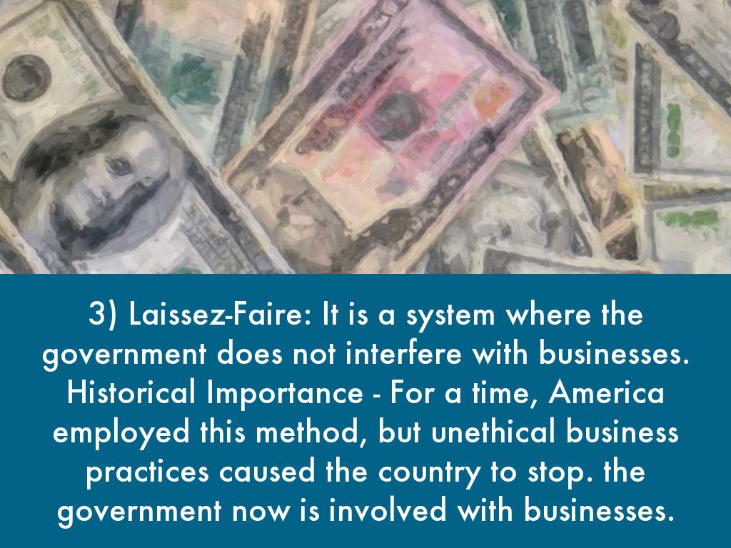 3) Laissez-Faire: It is a system where the government does not interfere with businesses. Historical Importance - For a time, America employed this method, but unethical business practices caused the country to stop. the government now is involved with businesses.
