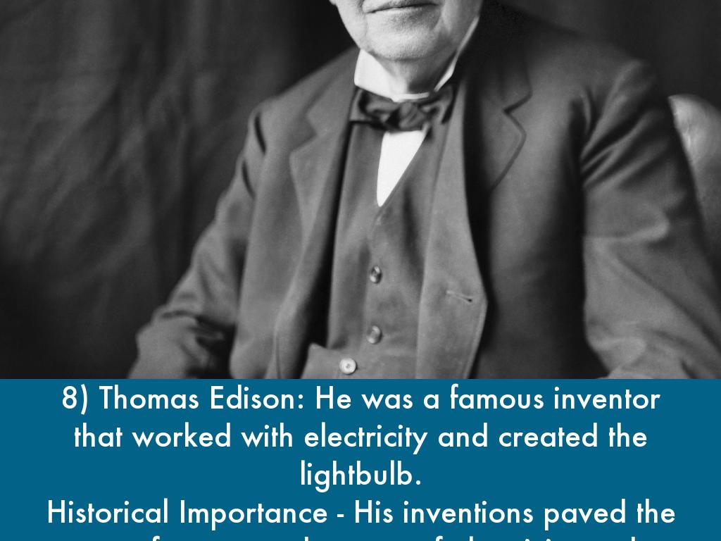8) Thomas Edison: He was a famous inventor that worked with electricity and created the lightbulb. Historical Importance - His inventions paved the way for our modern use of electricity and lighting system.