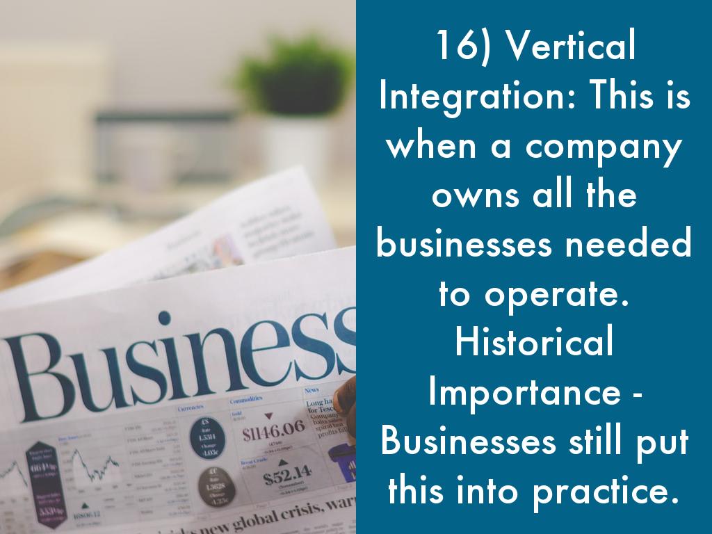 16) Vertical Integration: This is when a company owns all the businesses needed to operate. Historical Importance - Businesses still put this into practice.
