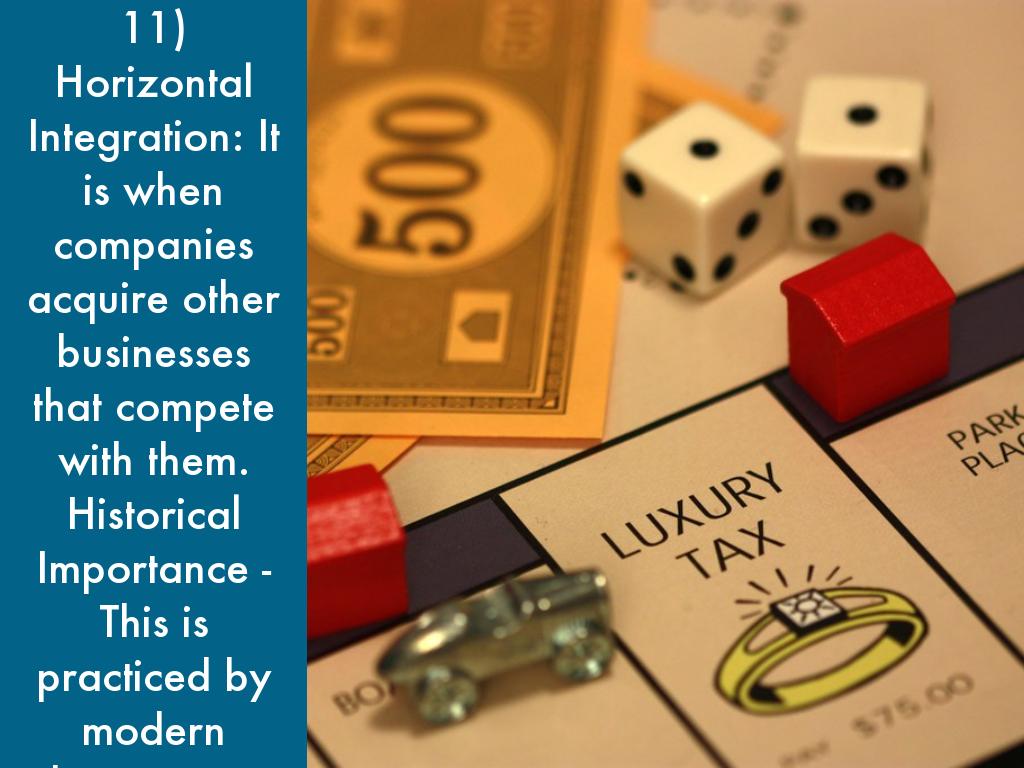 11) Horizontal Integration: It is when companies acquire other businesses that compete with them. Historical Importance - This is practiced by modern businesses.