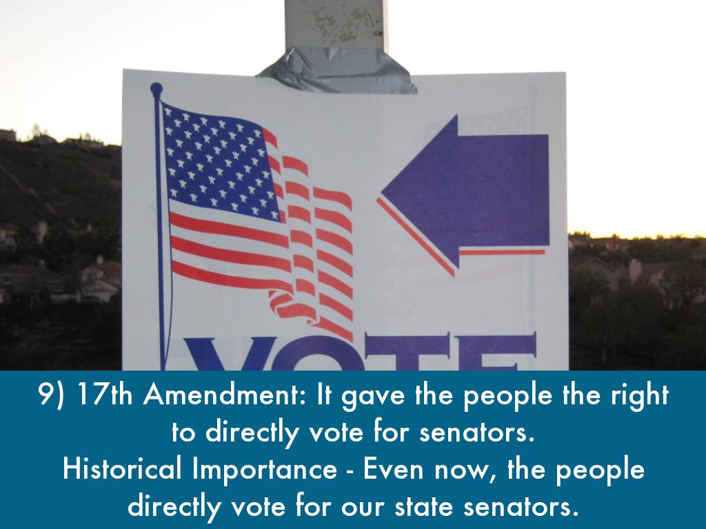9) 17th Amendment: It gave the people the right to directly vote for senators. Historical Importance - Even now, the people directly vote for our state senators.