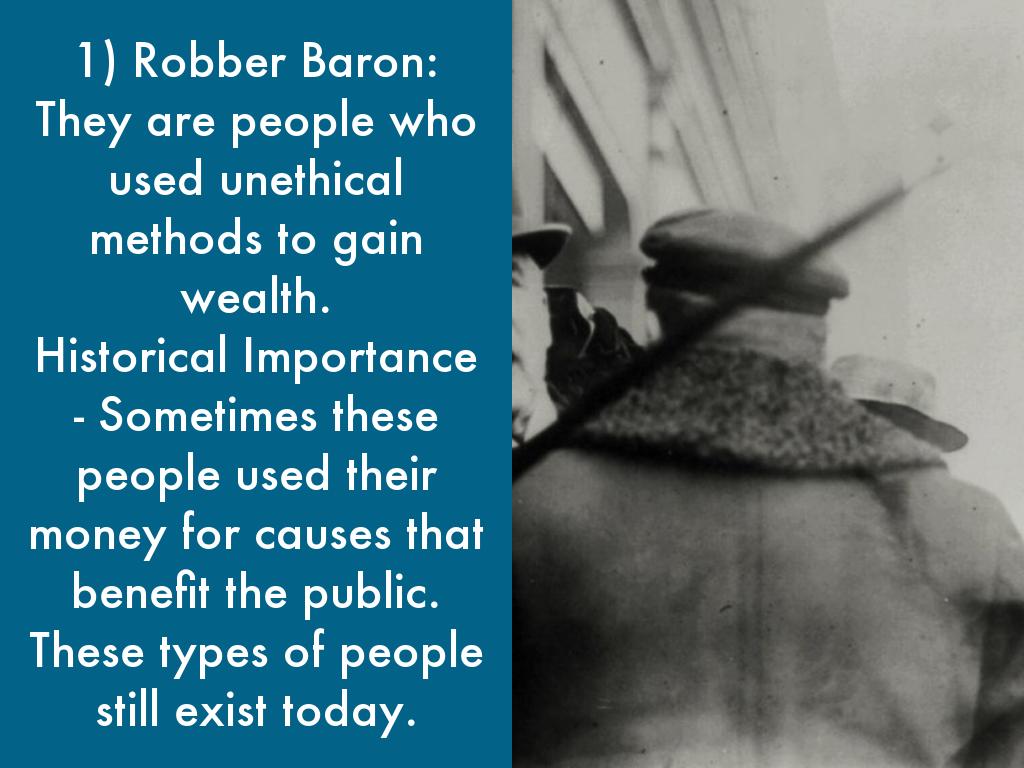 1) Robber Baron: They are people who used unethical methods to gain wealth. Historical Importance - Sometimes these people used their money for causes that benefit the public. These types of people still exist today.