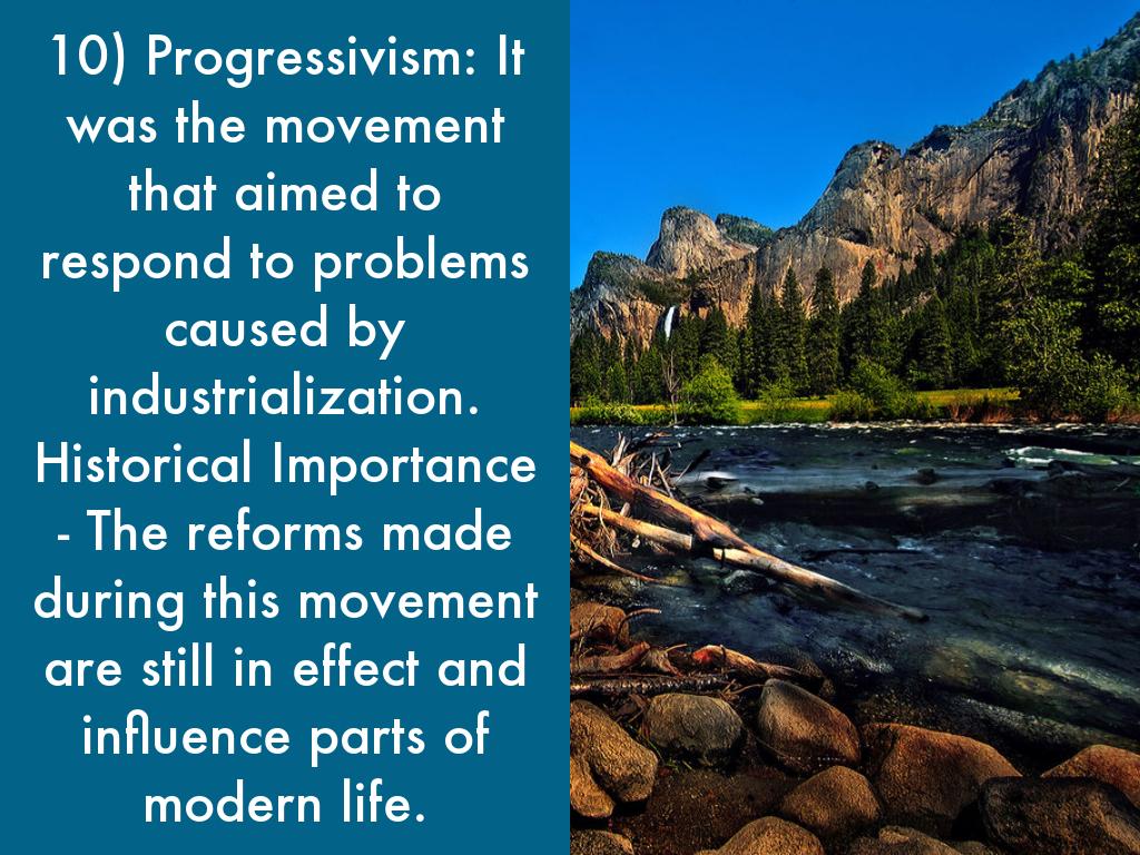 10) Progressivism: It was the movement that aimed to respond to problems caused by industrialization. Historical Importance - The reforms made during this movement are still in effect and influence parts of modern life.