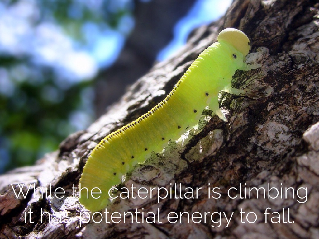 While the caterpillar is climbing it has potential energy to fall.