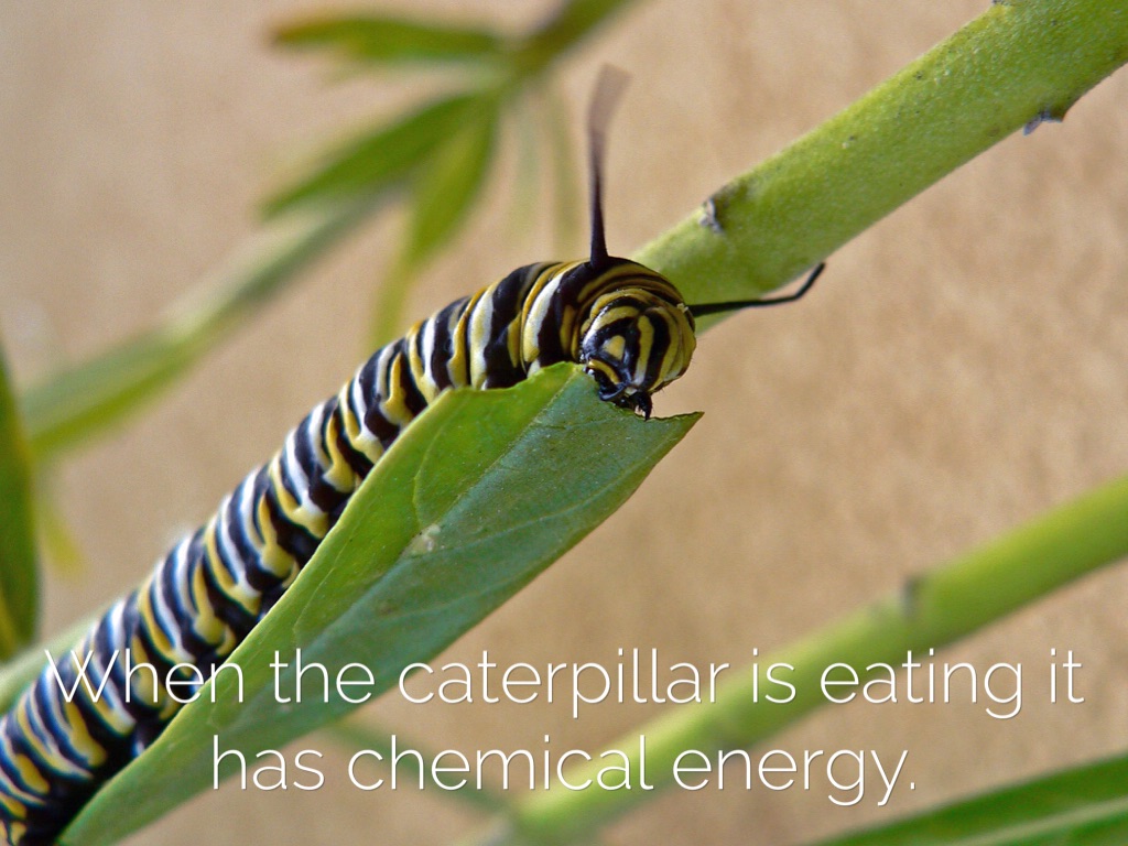 When the caterpillar is eating it has chemical energy.