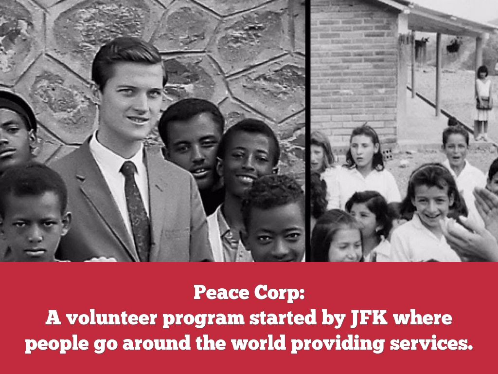 A volunteer program started by JFK where people go around the world providing services.