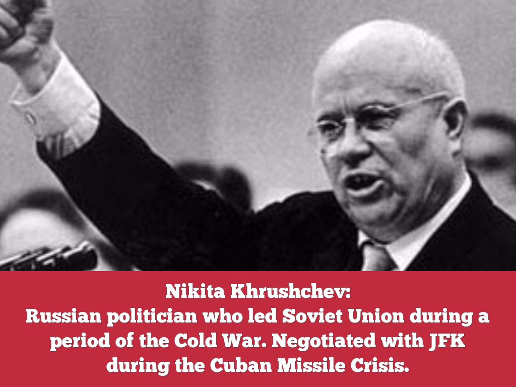 Russian politician who led Soviet Union during a period of the Cold War. Negotiated with JFK during the Cuban Missile Crisis.
