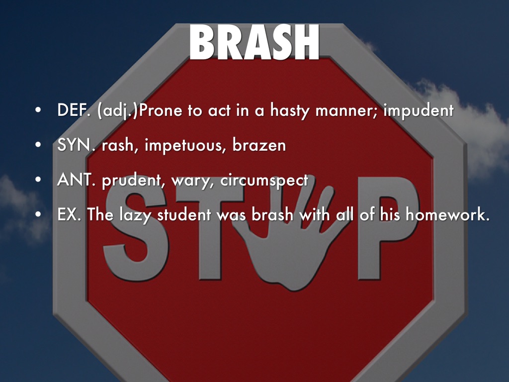 DEF. (adj.)Prone to act in a hasty manner; impudent
