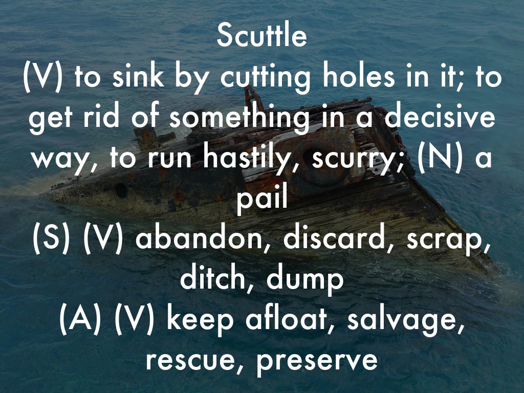 (V) to sink by cutting holes in it; to get rid of something in a decisive way, to run hastily, scurry; (N) a pail