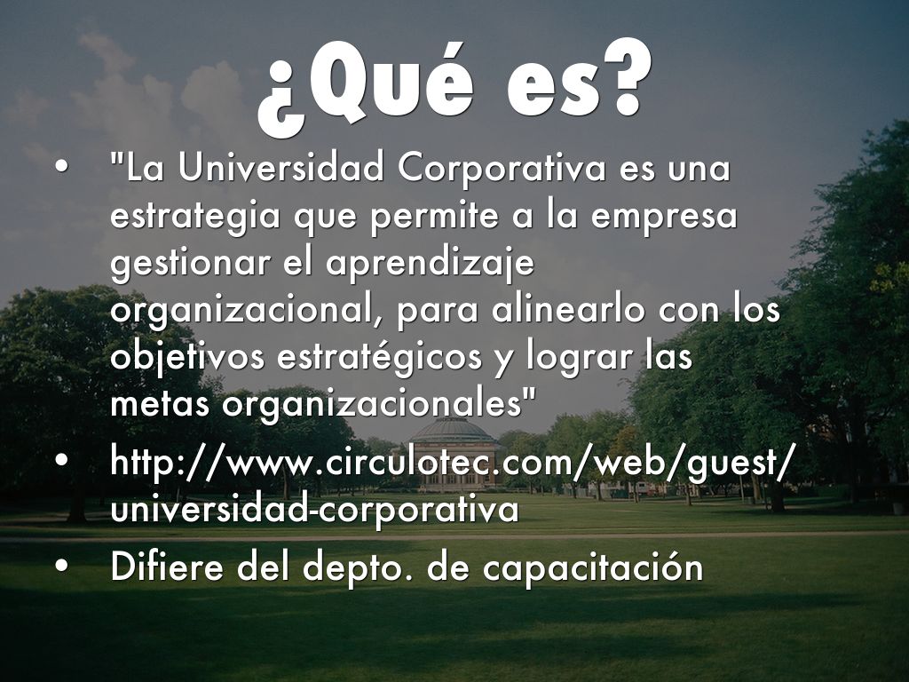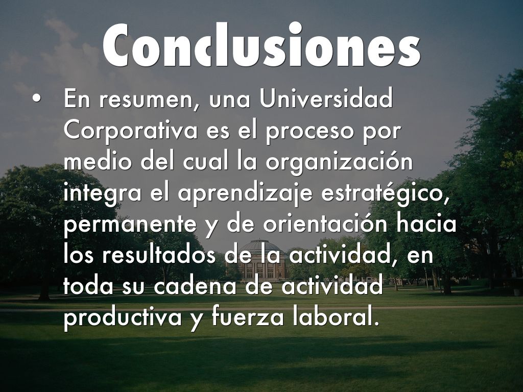 • En resumen, una Universidad Corporativa es el proceso por medio del cual la organización integra el aprendizaje estratégico, permanente y de orientación hacia los resultados de la actividad, en toda su cadena de actividad productiva y fuerza laboral.